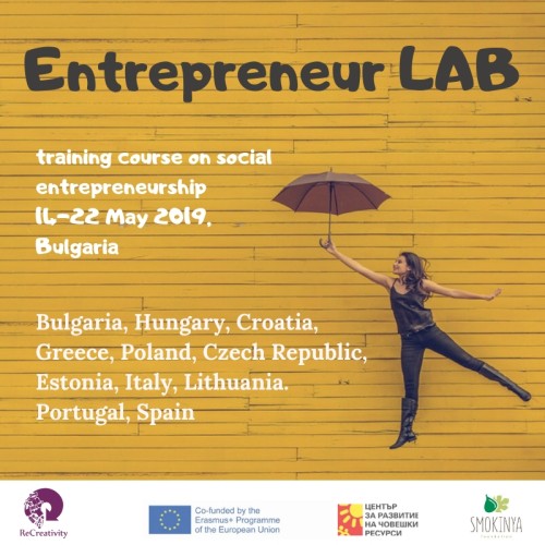 ENTREPRENEUR LAB is a 9-day international training, June 6-14, 2019, in Dolni Lozen, Bulgaria. In partnership with 11 organizations from 11 countries: Bulgaria, Hungary, Italy, Greece, Spain, Croatia, Poland, Czech Republic, Estonia, Lithuania, Portugal. Participants in the training will have a total of 31 participants: 26 participants, 3 facilitators and 2 professional trainers.